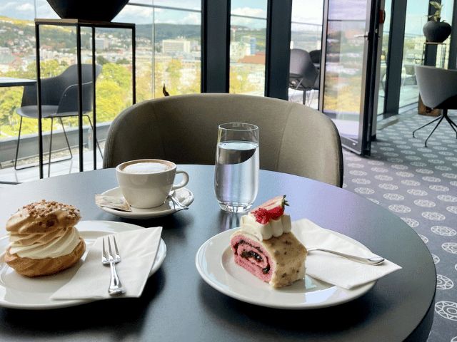 Usaďte se v elegantním interiéru nebo na slunné terase a dopřejte si panoramatický pohled na celé město Zlín i malebné okolí.